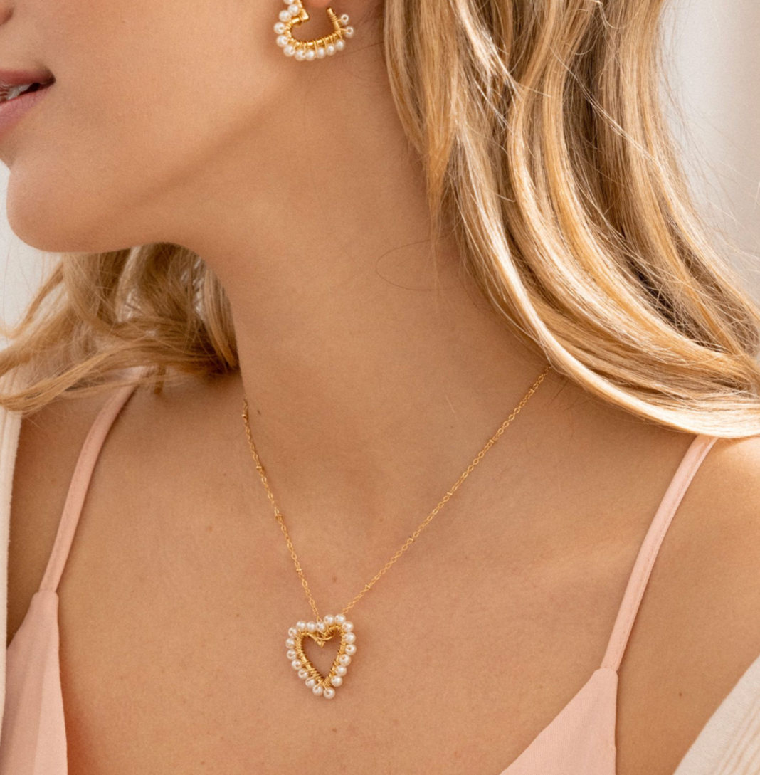 Nuestro Collar Corazón y Perlas está compuesto por delicadas perlas de vidrio y dijes bañados oro de 24 kilates.
