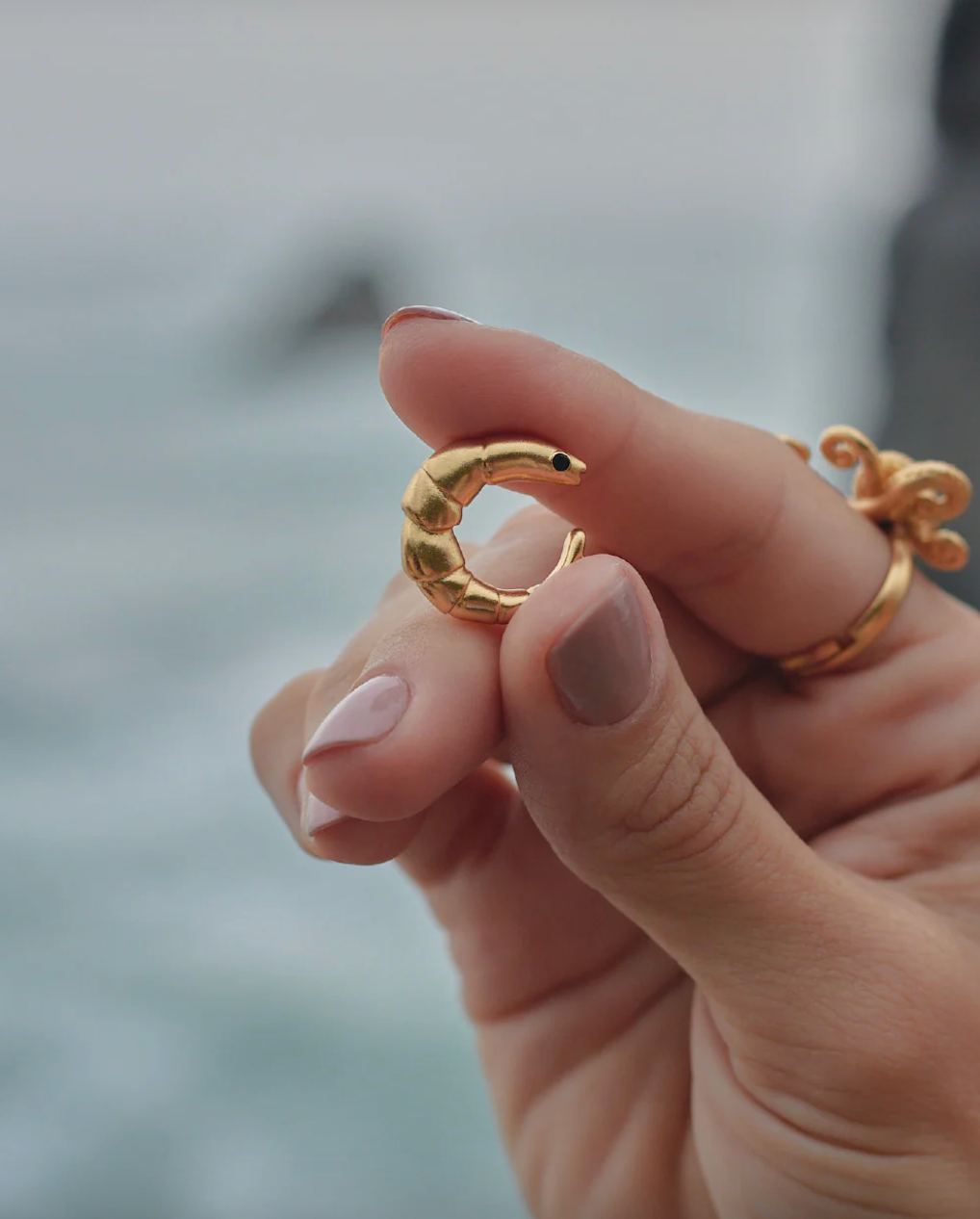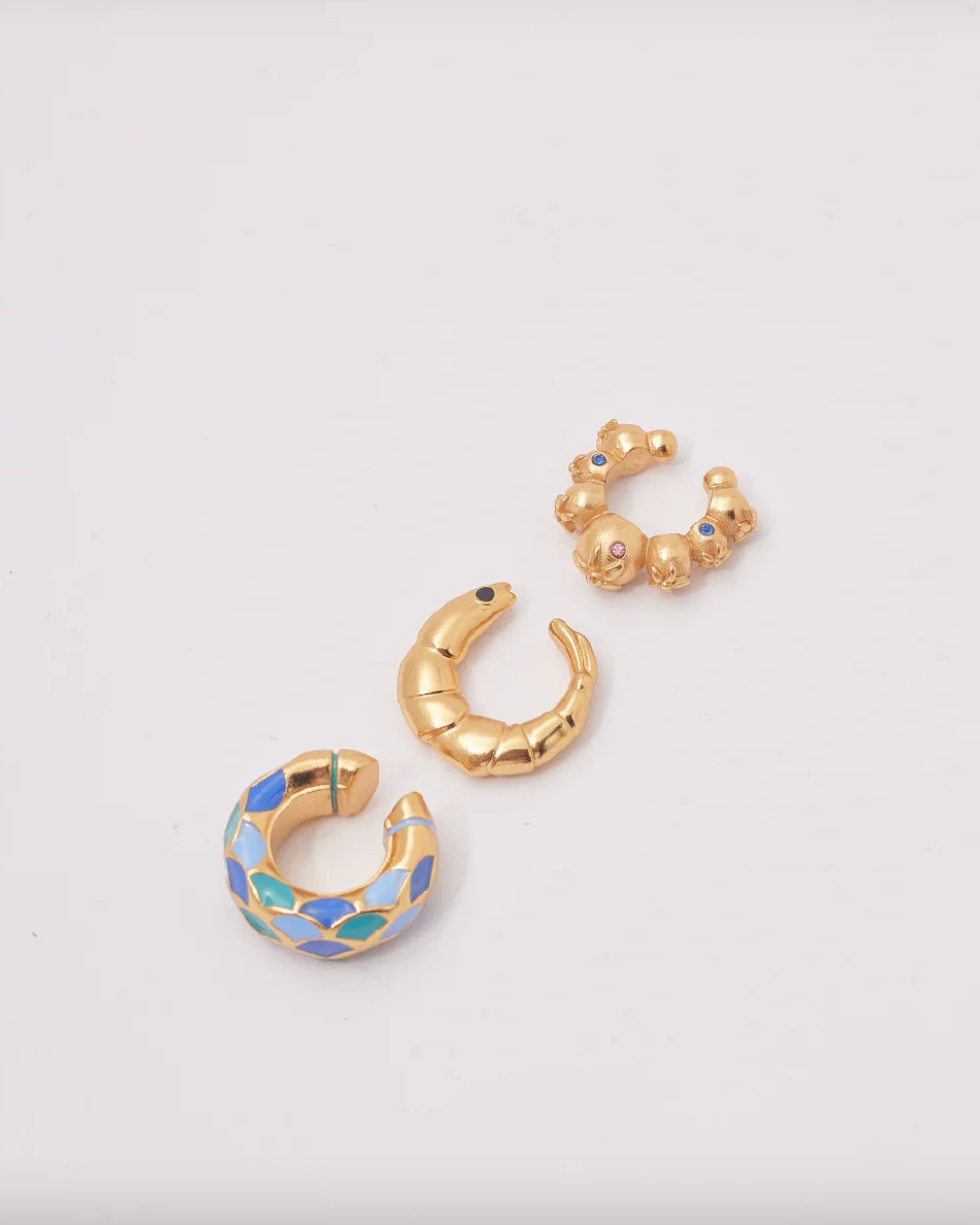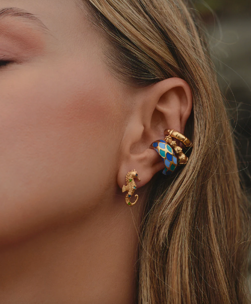 Earcuff elaborado en aleación de metales bañado en oro semibrillante pintado a mano con resina epóxica. Perfecto para sumar textura y brillo a tus combinaciones de oreja.