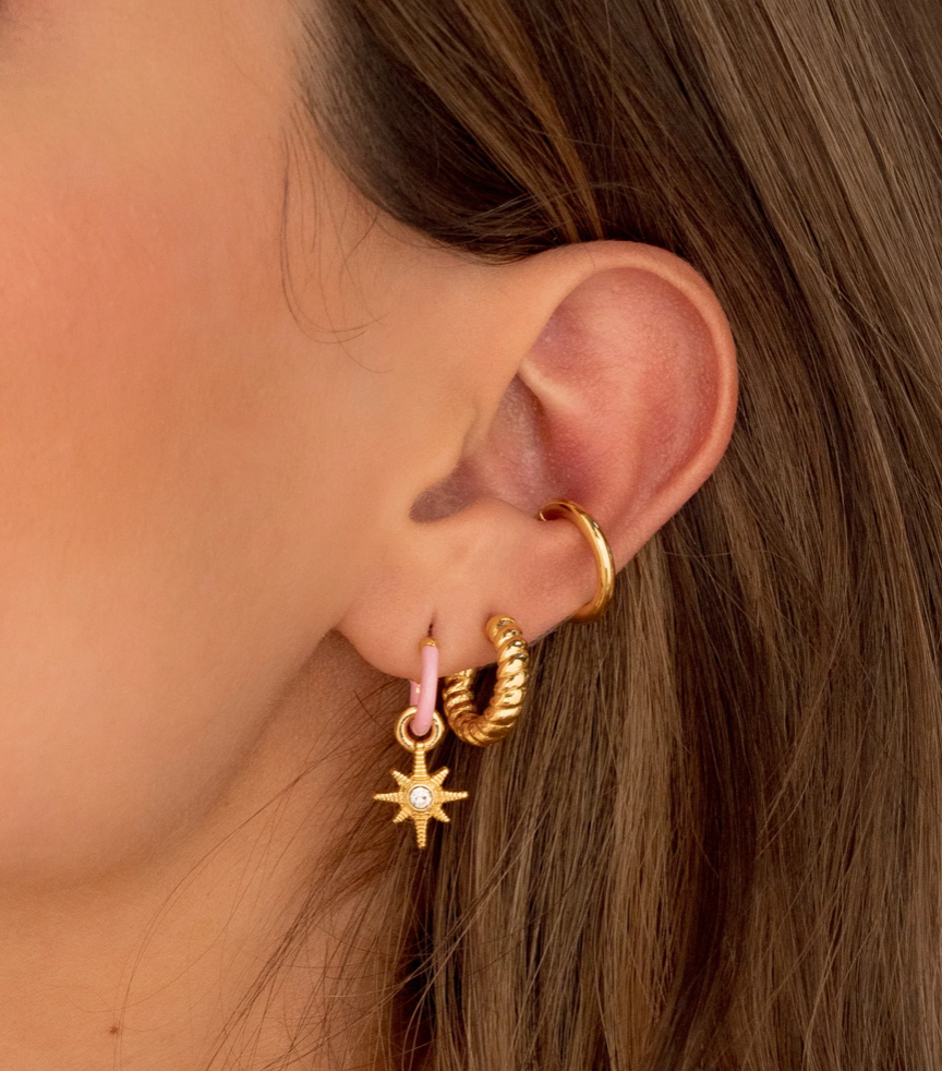 Earcuff ajustable, es un aro que no necesita perforación, se ajusta al tamaño de tu oreja para que no se caiga. Con baño de oro brasilero libre de niquel.