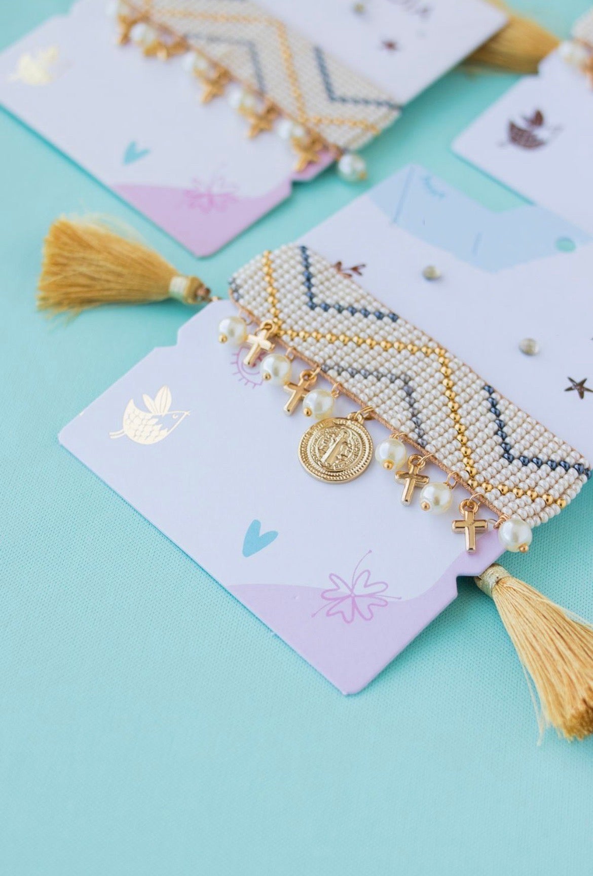 Este brazalete ha sido tejido a mano en color beige con dijes de cruces, perlas y una medalla de San Benito. Está hecho con cuentas en vidrio e hilo de alta calidad, terminaciones bañadas en oro, cierre ajustable y pompones.